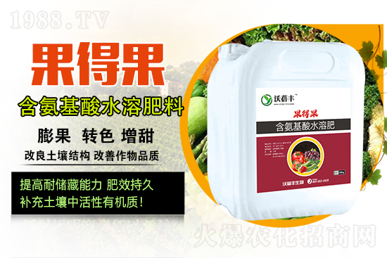 新密市沃蓓豐生物科技有限公司【含氨基酸水溶肥料-果得果】游離氨基酸含量達(dá)100g/L,微量元素硼、鐵、錳、鋅含量達(dá)20g/L,富含有機(jī)質(zhì)可迅速提高地溫,補(bǔ)充土壤中活性有機(jī)質(zhì);罨寥乐锌衫玫酿B(yǎng)分粒子,緩解過(guò)量施肥造成的土壤鹽害,改良土壤結(jié)構(gòu),改善作物品質(zhì),提早上市延長(zhǎng)作物采收期,提高作物的耐儲(chǔ)藏能力,肥效,后勁十足,在低溫條件下,膨果效果顯著。