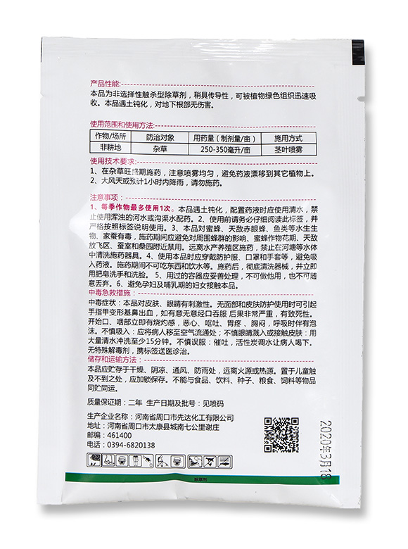 本品為非選擇性觸殺型除草劑,稍具傳導(dǎo)性,可被植物綠色組織迅速吸收。本品遇土鈍化,對(duì)地下根部無(wú)傷害。